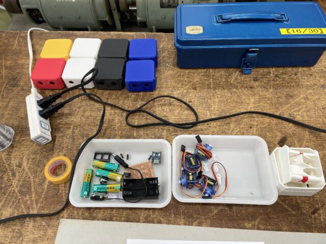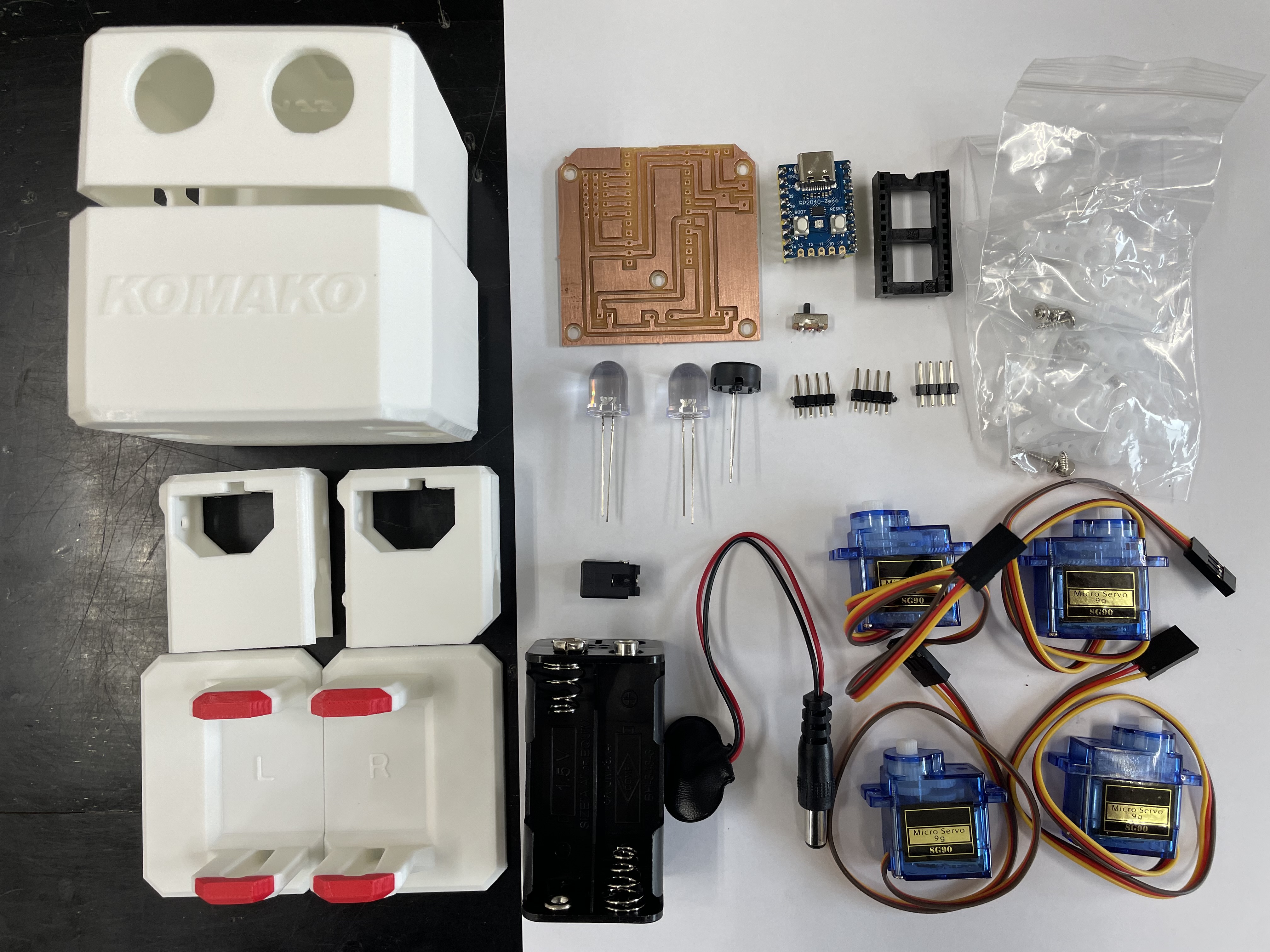 筐体と部品一式。目の部分は距離センサではなく大型のLEDを使用して価格を抑えた。