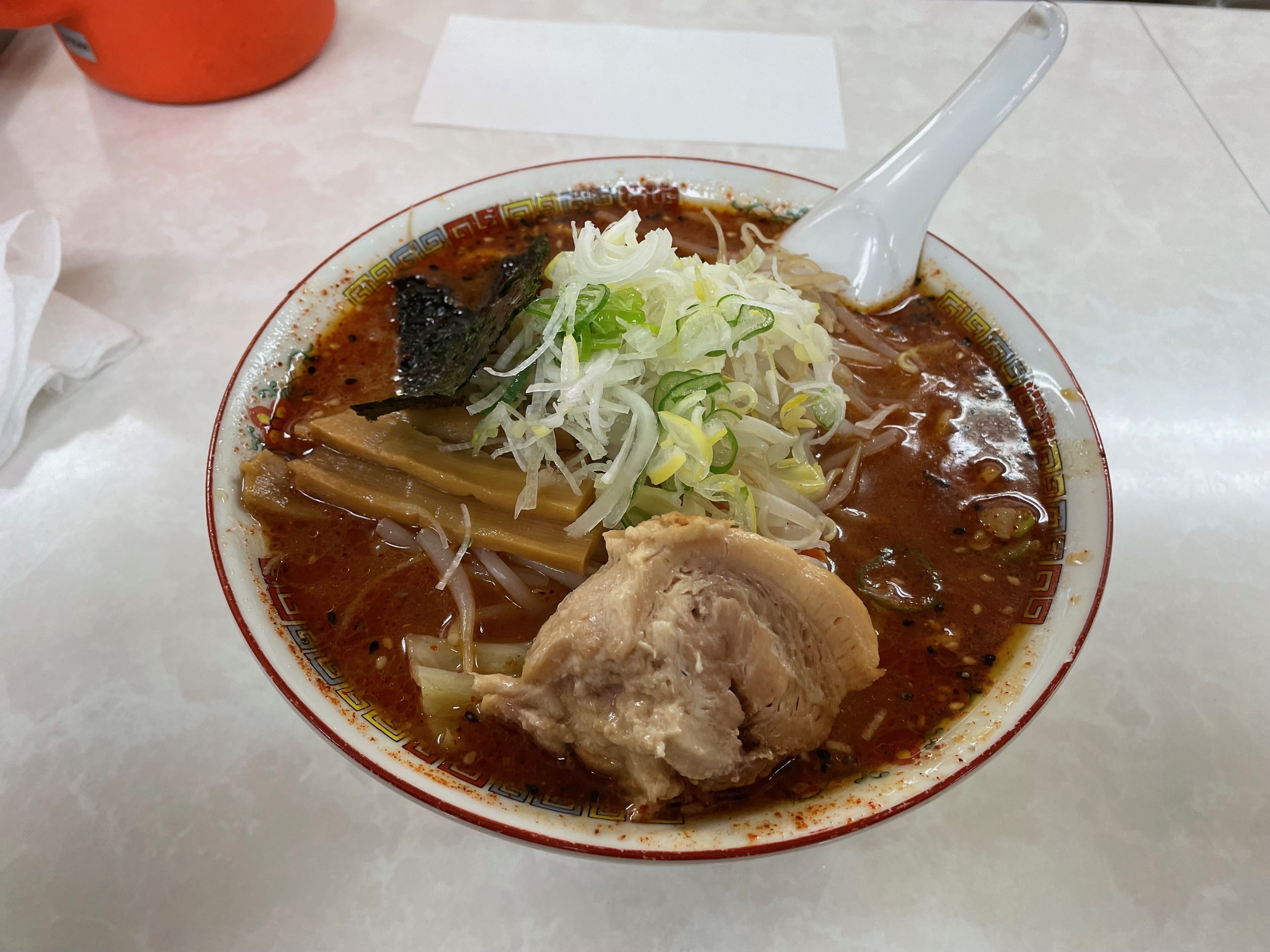 チャーシューが塊でゴロリと入っているが、味はいまいち…スープも辛いけど旨味は足りないかなぁ…