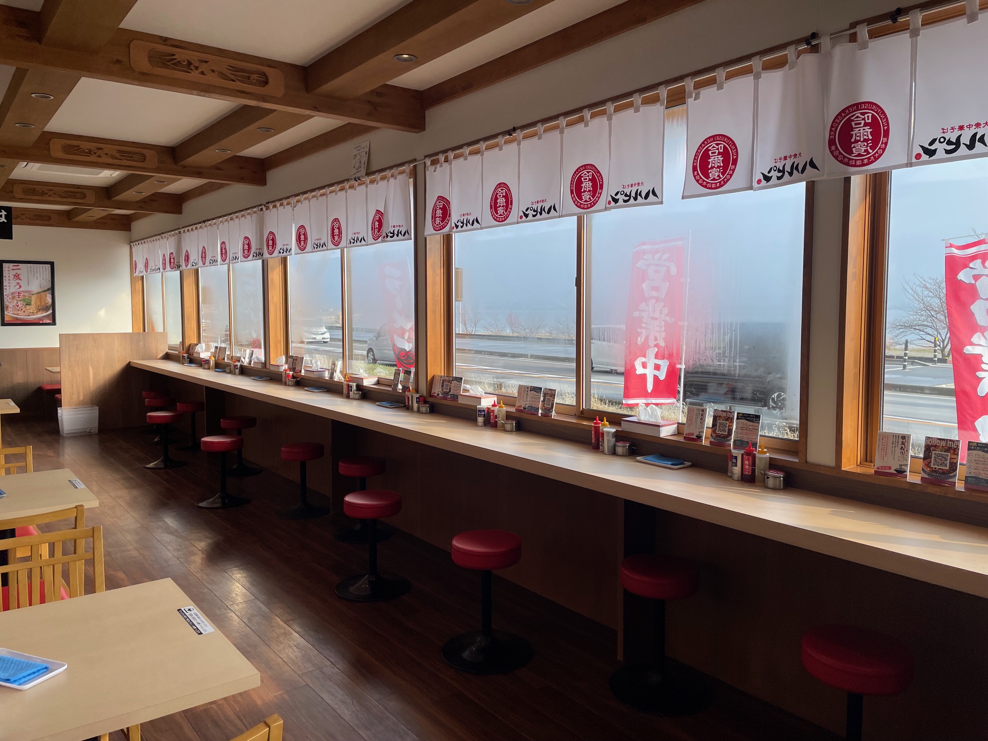 自分でお盆をもってカウンターに並ぶ「丸亀」スタイル。諏訪湖を目前に眺めるカウンター席へ。