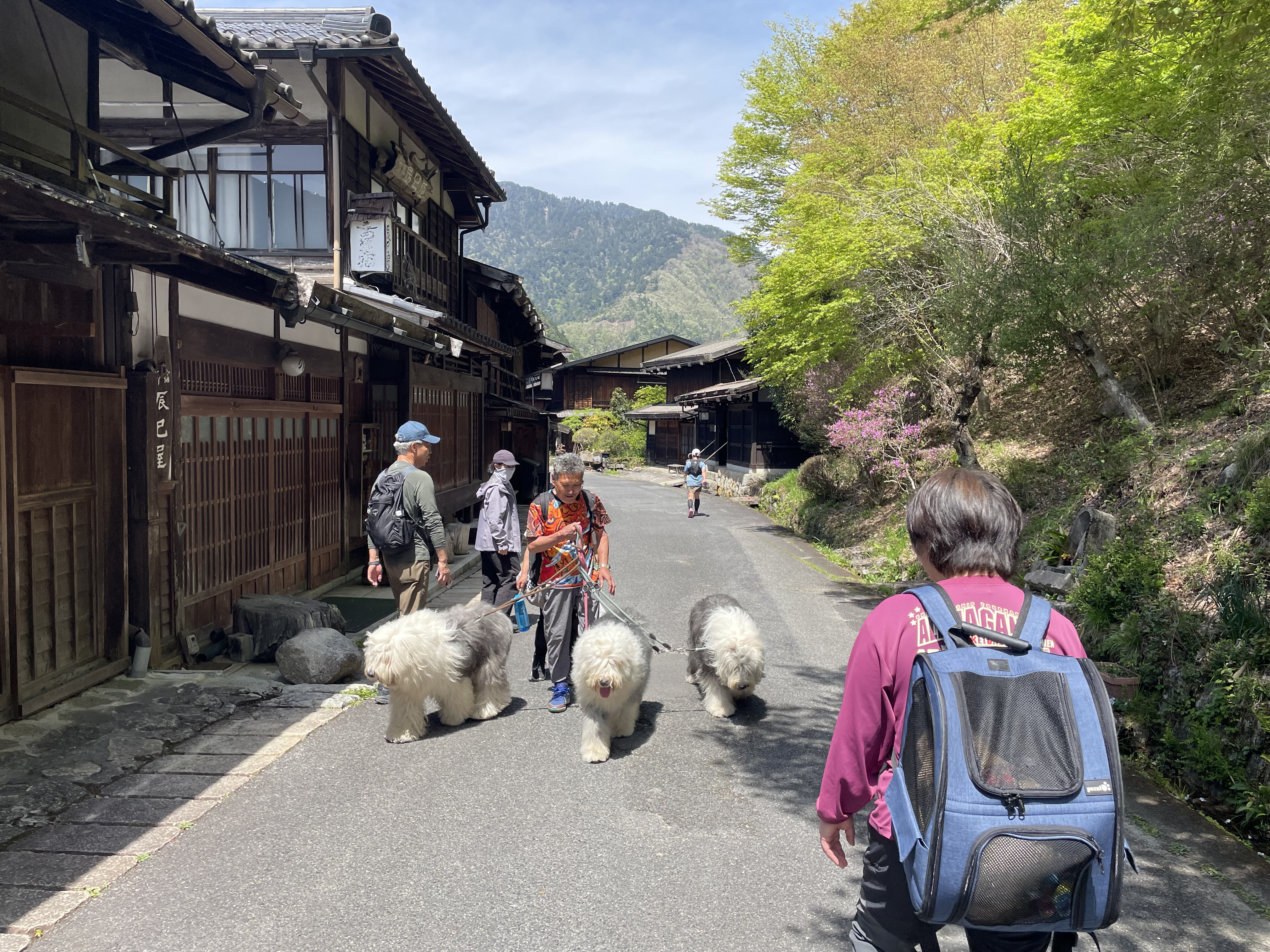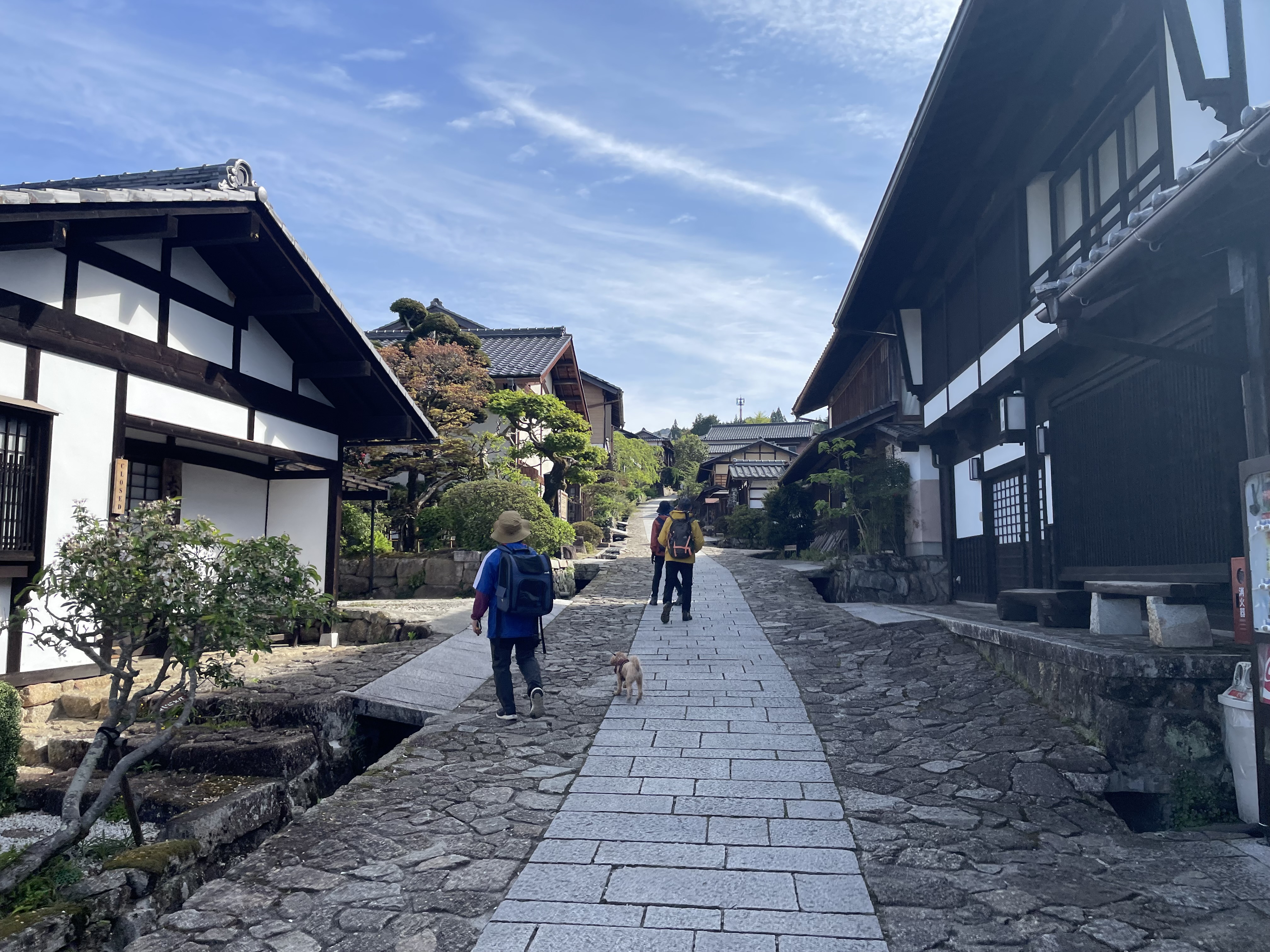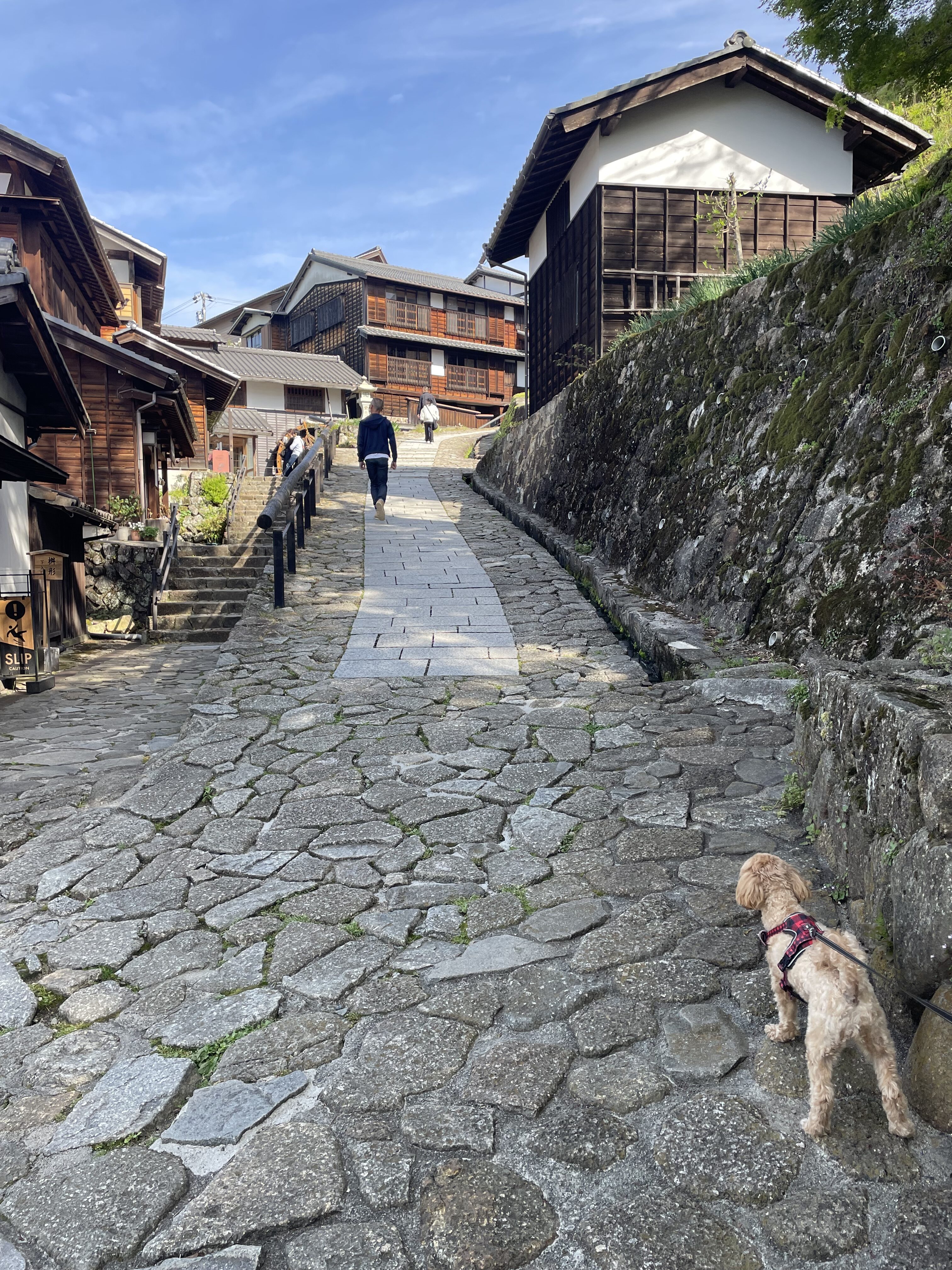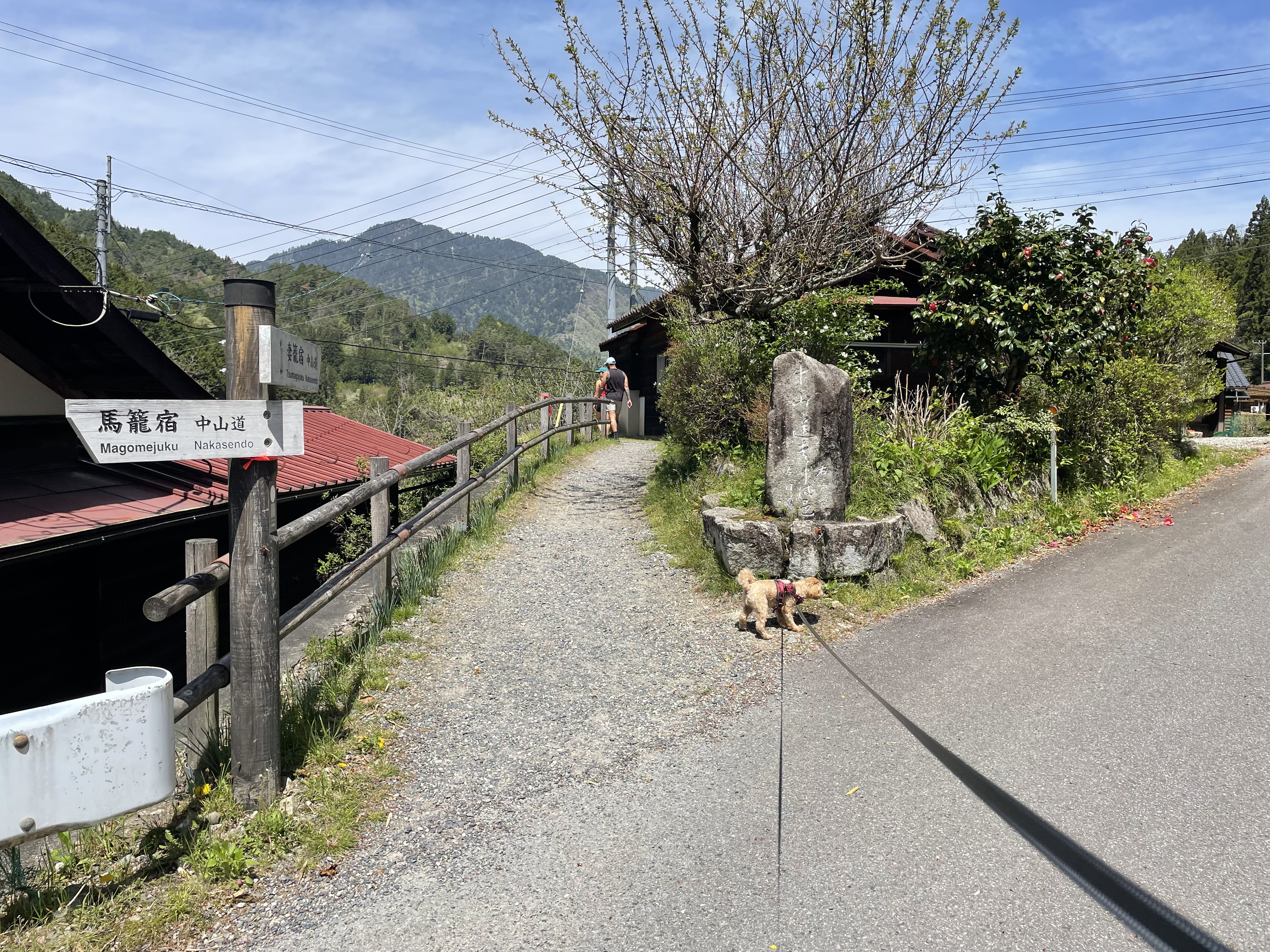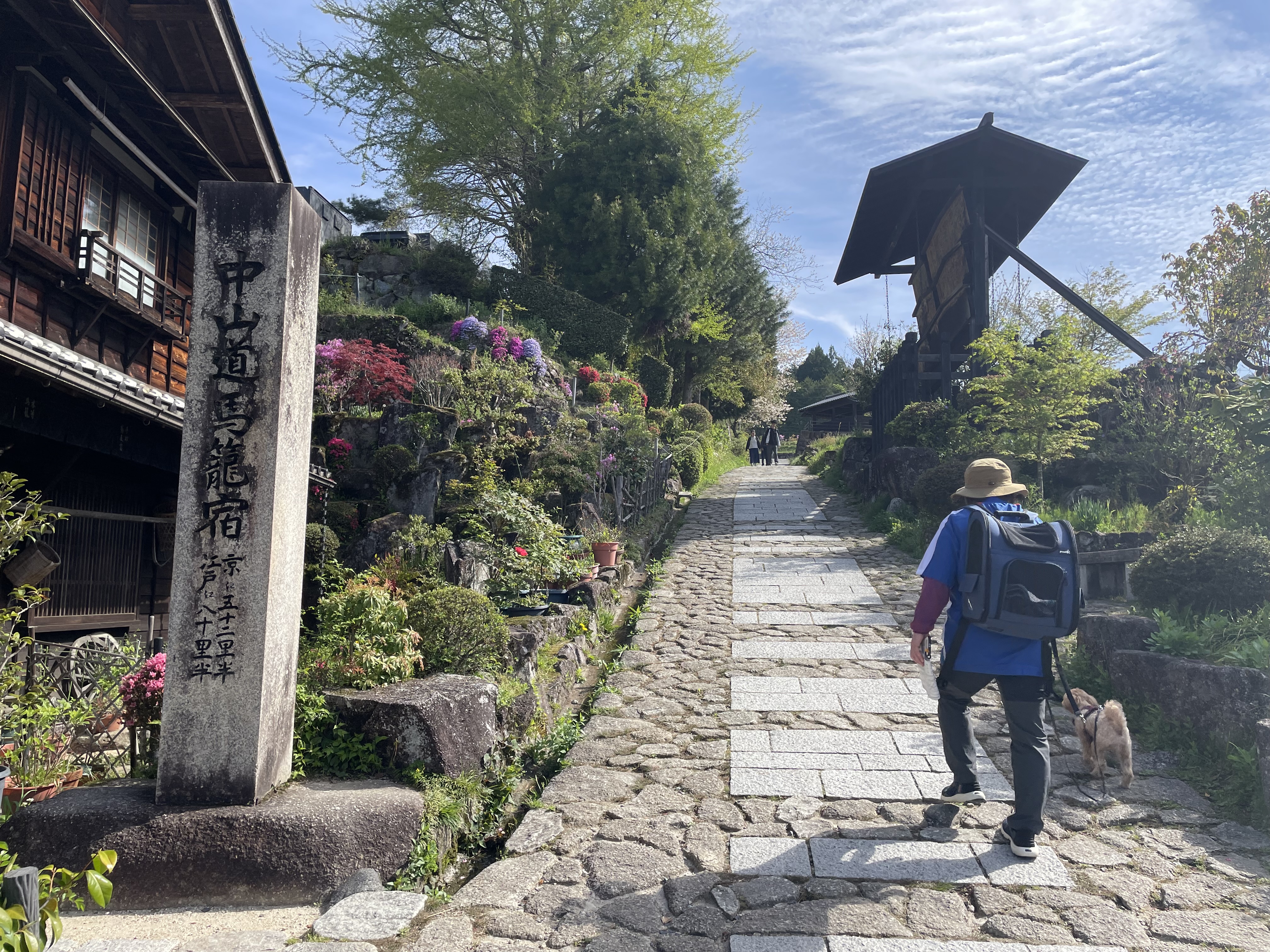 サムライロード(馬籠→妻籠)を犬と行く - Category - ちいさなたび 4月中旬の日曜日。犬も歩けそうなところということで、中山道の馬籠宿から妻籠宿までの通称「サムライロード」を歩いてみた。8時半過ぎに馬籠の駐車場に車を停め、坂道を歩きだす。犬がちょっと疲れたかなと思えば、かごに入れ男滝女滝も寄って、12時44分のバスで馬籠まで戻った。天気も良くて半袖でも暑い陽気。犬も疲れたが俺たちも心地よい一日だった。